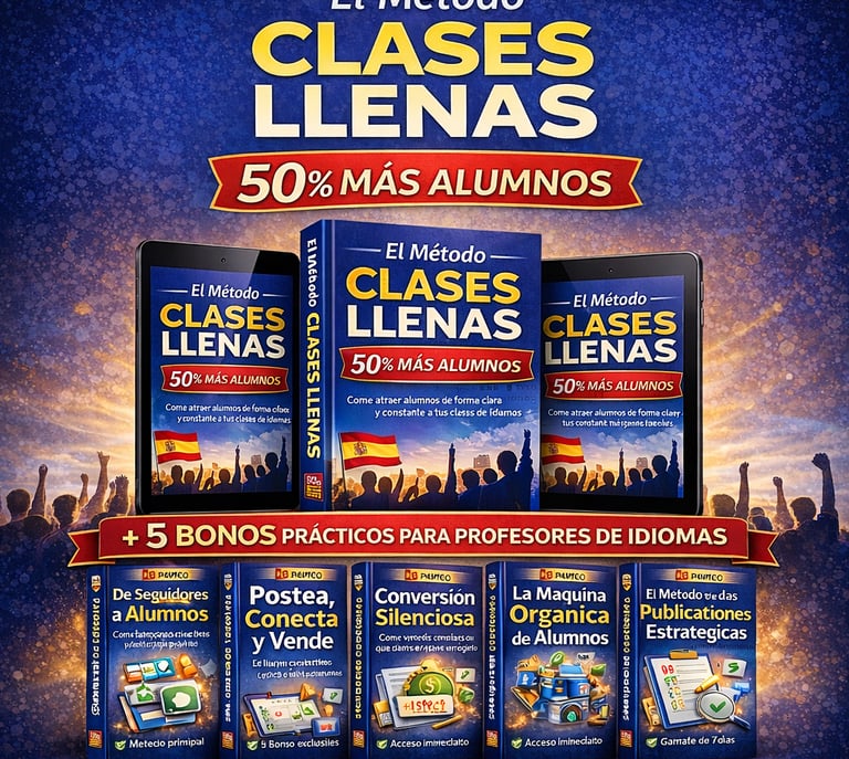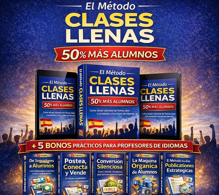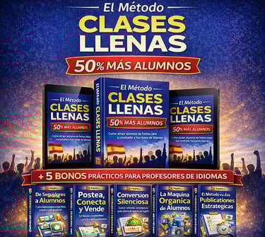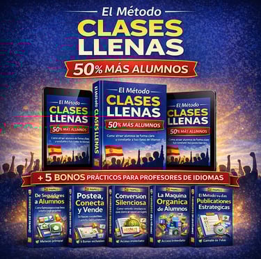 Es un método práctico creado para profesores de idiomas que quieren atraer más alumnos de forma clara y constante. A través de estrategias simples y aplicables, te muestra cómo posicionarte mejor, comunicar el valor de tus clases y convertir interés en matrículas reales, incluso si hoy dependes del boca a boca.